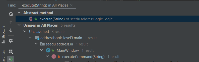 :bulb: Intellij Tip: The Search Everywhere’ feature can be used here. In particular, the ‘Find Symbol’ (‘Symbol’ here refers to methods, variables, classes etc.) variant of that feature is quite useful here as we are looking for a method named execute, not simply the text execute.